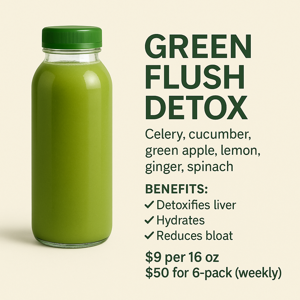 Flush out toxins and beat the bloat with our Green Flush Detox—a hydrating, alkalizing green juice made with fresh celery, cucumber, green apple, lemon, ginger, and spinach. Light and refreshing with a zingy ginger kick.